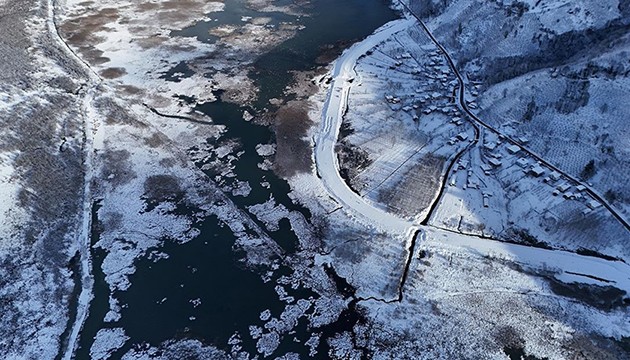 Yüzeyinde adacıkları andıran parça parça buz tabakalarının oluştuğu gölün yüzeyi ve beyaz örtüyle kaplanan çevresi havadan görüntülendi.