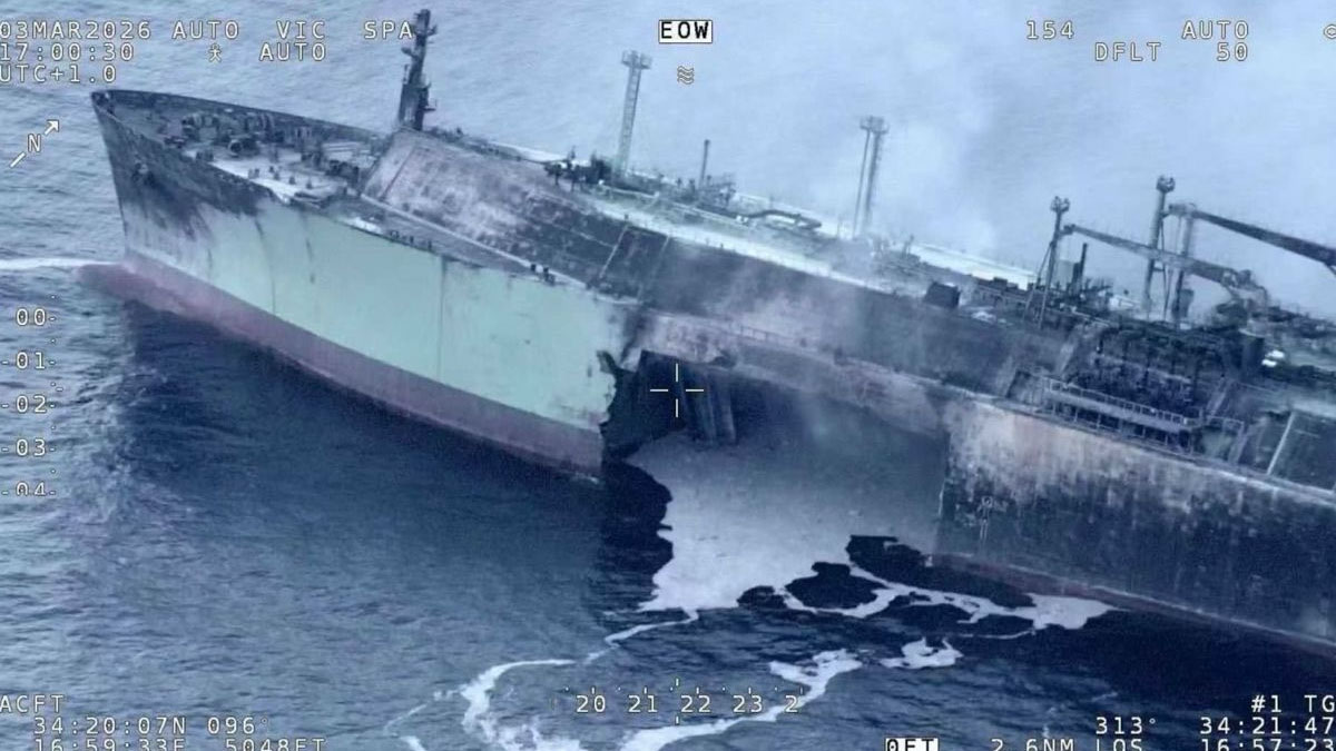 Gündüz saatlerinde askeri keşif uçakları (veya İHA'lar) tarafından çekilen ve üzerinde koordinat/hedefleme (HUD) verileri bulunan fotoğraflar ise hasarın boyutunu kanıtlıyor. Tankerin sancak (sağ) tarafında kamikaze deniz aracının çarpması sonucu metrelerce genişliğinde devasa bir delik açıldığı, geminin hızla su aldığı ve içindeki gazın/yakıtın denize sızarak yoğun bir duman çıkardığı net bir şekilde görülüyor.