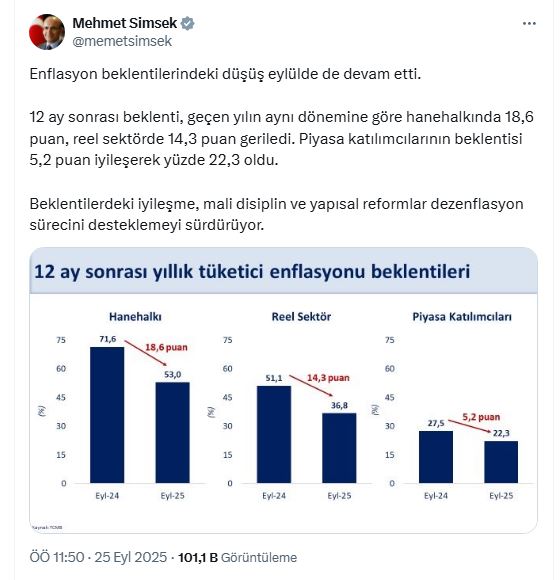 Enflasyon beklentilerindeki düşüşün Eylül ayında da sürdüğünü belirten Şimşek, "Enflasyon beklentilerindeki düşüş Eylül'de de devam etti. 12 ay sonrası beklenti, geçen yılın aynı dönemine göre hanehalkında 18,6 puan, reel sektörde 14,3 puan geriledi. Piyasa katılımcılarının beklentisi 5,2 puan iyileşerek yüzde 22,3 oldu. Beklentilerdeki iyileşme, mali disiplin ve yapısal reformlar dezenflasyon sürecini desteklemeyi sürdürüyor" ifadelerini kullandı.