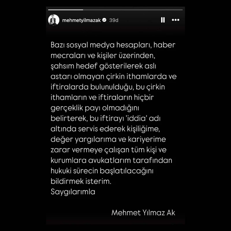 "Bazı sosyal medya hesapları, haber mecraları ve kişiler üzerinden, şahsım hedef gösterilerek aslı astarı olmayan çirkin ithamlarda ve iftiralarda bulunulduğu, bu çirkin ithamların ve iftiraların hiçbir gerçeklik payı olmadığını belirterek, bu iftirayı 'iddia' adı altında servis ederek kişiliğime, değer yargılarıma ve kariyerime zarar vermeye çalışan tüm kişi ve kurumlara avukatlarım tarafından hukuki sürecin başlatılacağını bildirmek isterim. Saygılarımla."