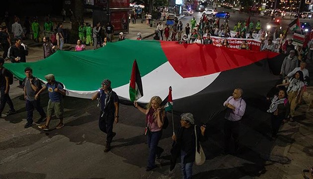 Başkent Meksiko'da "Filistin için bir ışık" adı altında toplanan yüzlerce gösterici bayrak ve dövizlerle Filistin'e destek sloganları attı.