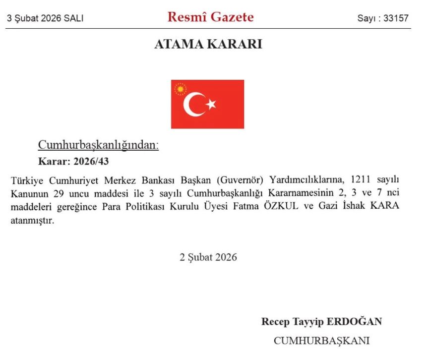 Cumhurbaşkanı Recep Tayyip Erdoğan'ın imzasıyla yayımlanan karara göre TCMB'de başkan yardımcılıklarına Fatma Özkul ile Gazi İshak Kara atandı.