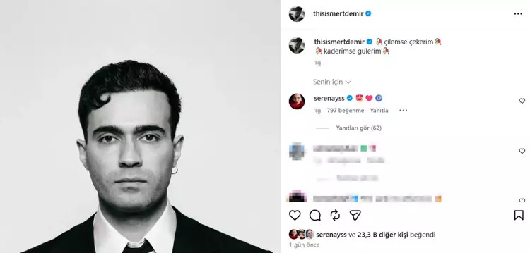 Tüm iddia ve dedikodulara rağmen ünlü çiftin mutlu beraberliği devam ediyor. 33 yaşındaki Serenay Sarıkaya, sevgilisi Mert Demir'in yeni paylaşımına kalp ve nazar boncuğu emojisi ekleyerek iddialara yeniden yanıt verdi.