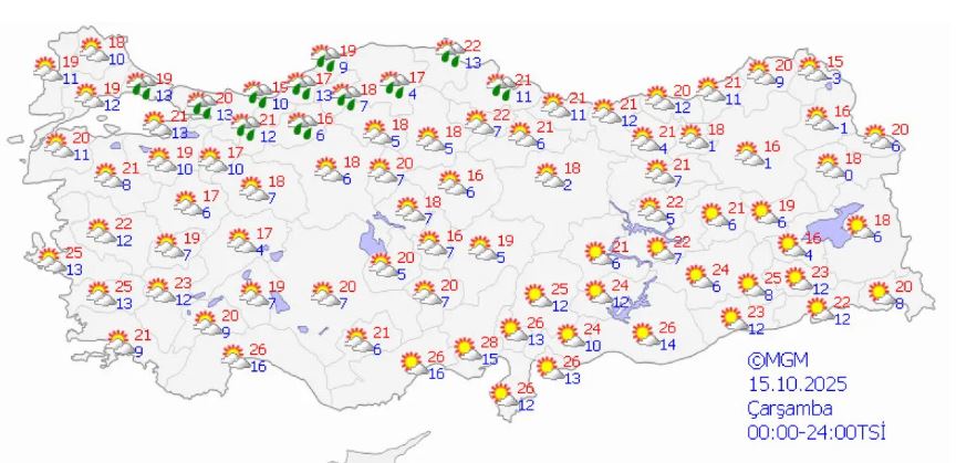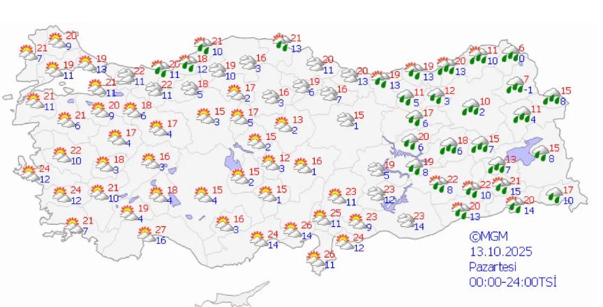 Yapılan tahminlere göre, yurdun kuzey, iç ve batı kesimleri parçalı ve çok bulutlu, Marmara (Çanakkale hariç), İç Anadolu’nun kuzeybatısı, Batı ve Orta Karadeniz, Doğu Karadeniz kıyıları ile Kütahya, Uşak, Afyonkarahisar, Konya, Aksaray, Kırşehir, Yozgat ve Artvin çevreleri yağmur ve sağanak yağışlı, yer yer gök gürültülü sağanak yağışlı olacak.