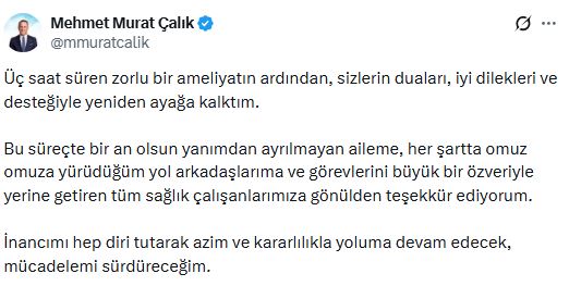 “Üç saat süren zorlu bir ameliyatın ardından, sizlerin duaları, iyi dilekleri ve desteğiyle yeniden ayağa kalktım. Bu süreçte bir an olsun yanımdan ayrılmayan aileme, her şartta omuz omuza yürüdüğüm yol arkadaşlarıma ve görevlerini büyük bir özveriyle yerine getiren tüm sağlık çalışanlarımıza gönülden teşekkür ediyorum.”