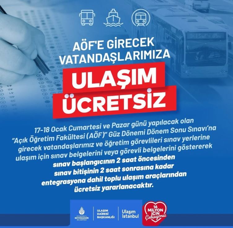 Sınava girecek öğrenciler ve öğretim görevlileri sınav ve görevli belgelerini göstererek ücretsiz ulaşımdan faydalanabilecek.