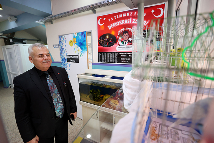 Okul binasının bir köşesine de akvaryum koyan Erginsoy, öğrencileriyle balıkların bakımını yapıyor.
