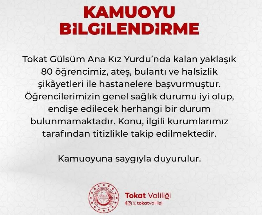 Tokat Valiliği'nden konuya ilişkin yapılan yazılı açıklamada, "Tokat Gülsüm Ana Kız Yurdu'nda kalan yaklaşık 80 öğrencimiz, ateş, bulantı ve halsizlik şikayetleri ile hastanelere başvurmuştur. Öğrencilerimizin genel sağlık durumu iyi olup, endişe edilecek herhangi bir durum bulunmamaktadır. Konu, ilgili kurumlarımız tarafından titizlikle takip edilmektedir" ifadelerine yer verildi.