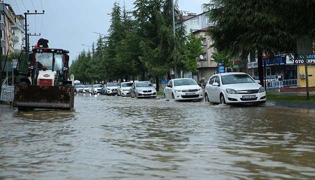 İlçede aralıklarla süren sağanak, kısa sürede şiddetini artırdı. Yağışla birlikte ilçedeki bazı yol ve caddelerde su birikintileri oluştu.