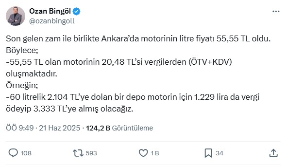 "Son gelen zam ile birlikte Ankara’da motorinin litre fiyatı 55,55 TL oldu.