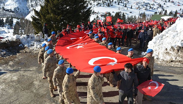 Trabzon'un Şalpazarı ilçesinin Hanyanı mevkisinde başlayan ve Sis Dağı'na kadar devam eden yürüyüşe katılanlar, metrelerce uzunluğundaki Türk bayrağını taşıdı.