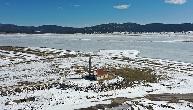 Buz tabakasıyla kaplanan göl ve yakınındaki cami güzel görüntü oluşturdu.