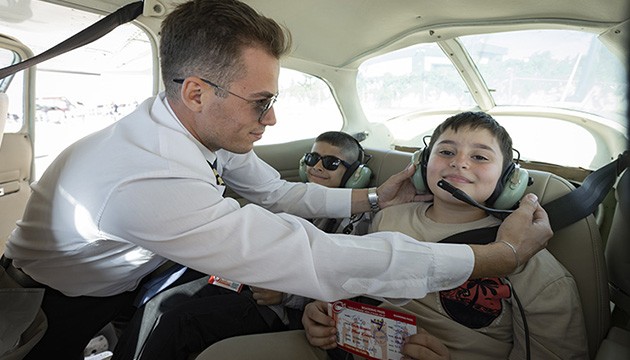 Daha sonra tek motorlu uçaklara bindirilen çocuklar, yaklaşık yarım saat boyunca gökyüzünde kalarak unutamayacakları anlar yaşadı.