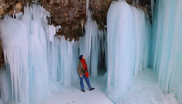 Hava sıcaklığının gece saatlerinde sıfırın altında 20 dereceye kadar düştüğü bölgedeki şelale dondu.