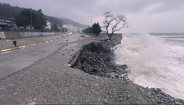 Karayolları ekiplerinin önlem aldığı yolda, dalgaların caddeye taşıdığı moloz yığınlarının temizlenmesi amacıyla çalışma yürütüldü.