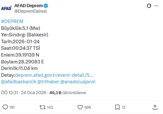 AFAD Deprem Dairesi verilerine göre, deprem 24 Ocak 2026 tarihinde saat 00.24’te kaydedildi. Yerin 11,04 kilometre derinliğinde gerçekleşen depremin merkez üssü Sındırgı olarak açıklandı.