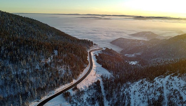 Beyaz örtüye eşlik eden sis dronla görüntülendi.