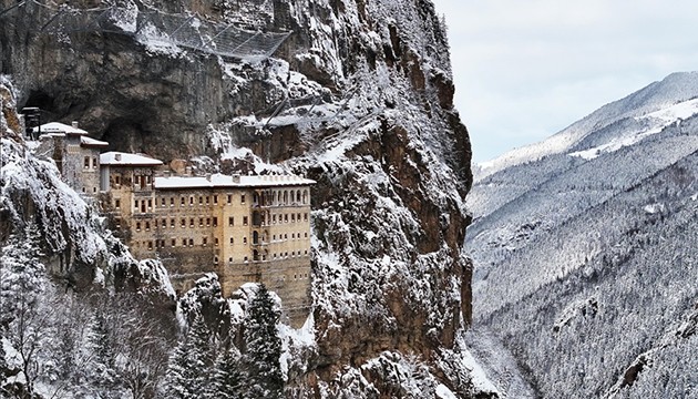 Karadağ'ın Altındere Vadisi'ne bakan eteğinde, vadiden yaklaşık 300 metre yükseklikteki ormanlık alanda kayalar oyularak yapılmış, halk arasında "Meryem Ana" adıyla da bilinen Sümela Manastırı, bölge genelinde iki gündür etkili olan yağışın ardından tekrar beyaza büründü.