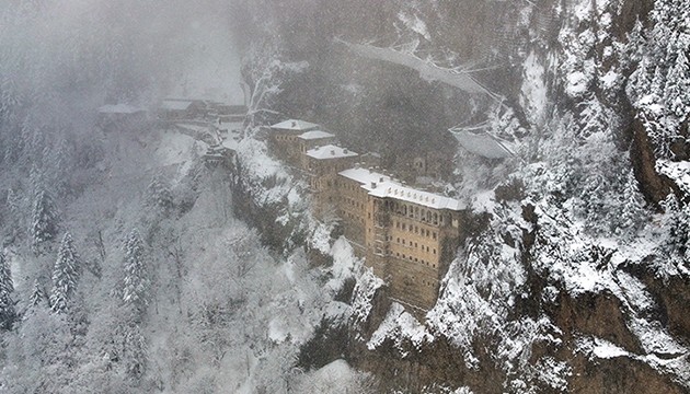 Karadağ'ın Altındere Vadisi'ne bakan eteğinde, vadiden yaklaşık 300 metre yükseklikteki ormanlık alanda kayalar oyularak yapılmış, halk arasında "Meryem Ana" adıyla bilinen Sümela Manastırı da etkili olan yağışın ardından beyaza büründü.