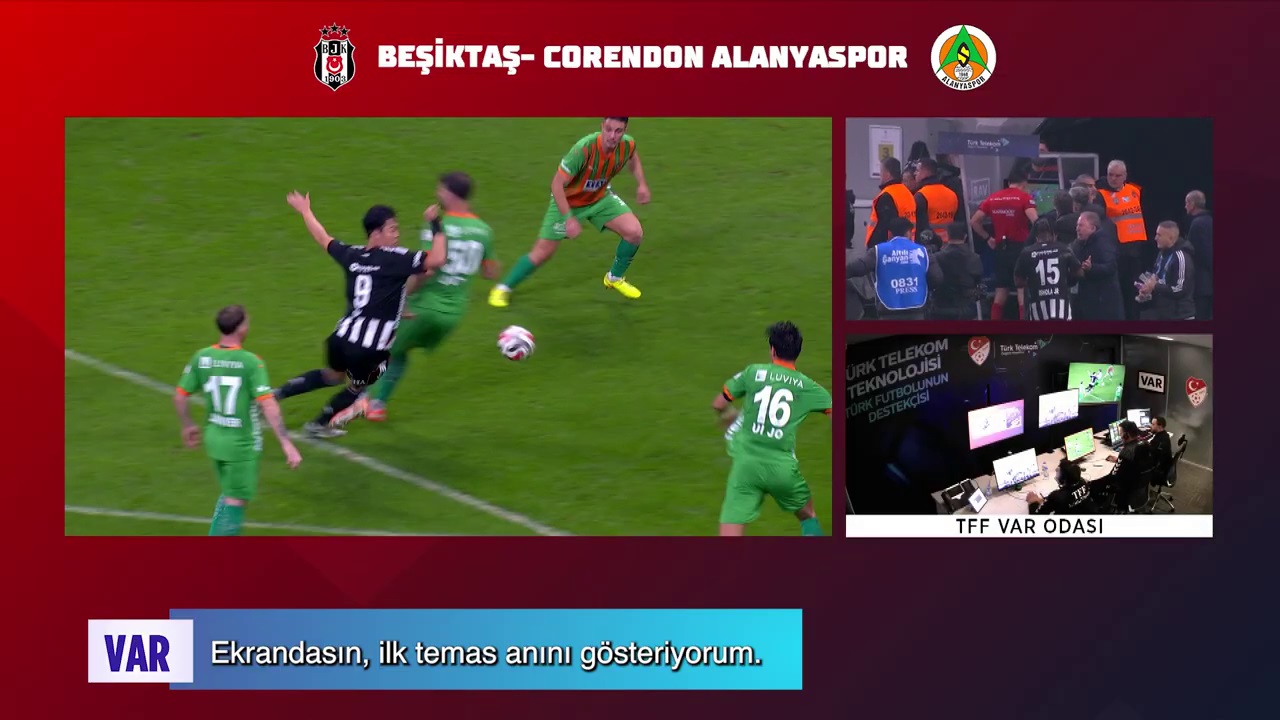 Beşiktaş-Alanyaspor karşılaşmasında Beşiktaş lehine verilen penaltı ve geçerli sayılan gol pozisyonlarına ilişkin VAR-hakem diyalogları kamuoyuyla paylaşıldı. Kayıtlarda, penaltı pozisyonunda temasın ceza sahası içinde olduğu değerlendirilirken, gol pozisyonunda ise ofsaytta bulunan oyuncunun rakibini etkilemediği gerekçesiyle gol kararı verildiği görüldü.