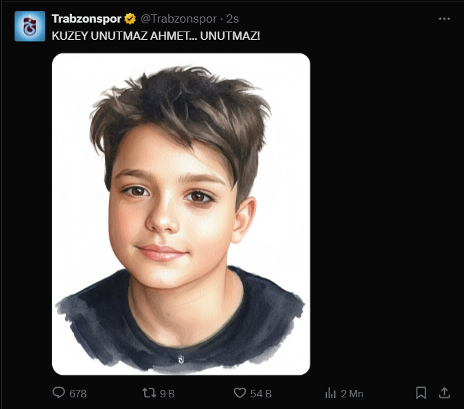 Trabzonspor, Mattia Ahmet Minguzzi için yaptığı paylaşımda "KUZEY UNUTMAZ AHMET... UNUTMAZ!" dedi.