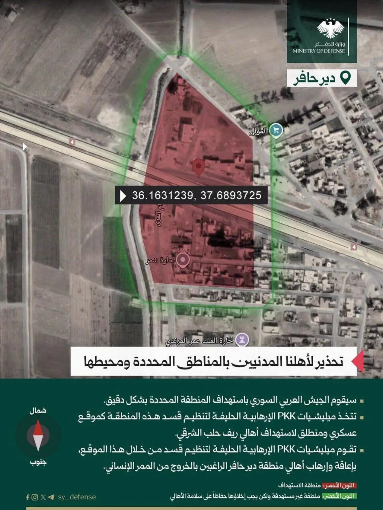 Suriye ordusu, olası askeri hareketlilik nedeniyle sivillere, Deyr Hafir çevresinde askeri hedef olarak değerlendirilen noktalardan uzak durmaları çağrısında bulundu.