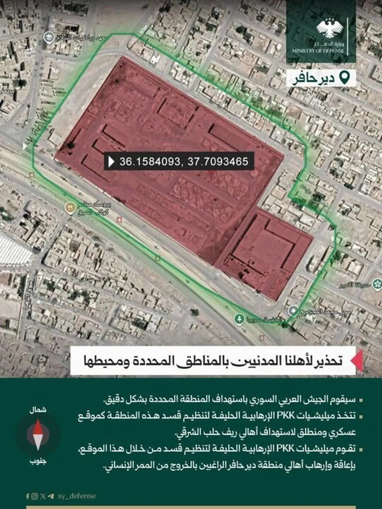 Ordu tarafından basına gönderilen yazılı açıklamada, Deyr Hafir beldesinde yer alan dört farklı noktanın koordinatlarının haritalar üzerinde işaretlendiği bildirildi. Açıklamada, söz konusu alanların SDG güçleri ile birlikte eski Esad rejimi unsurlarının da bulunduğu bölgeler olduğu ifade edildi.