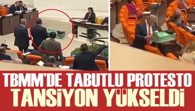 Cumhuriyet Halk Partisi (CHP) Adana Milletvekili Ayhan Barut, çiftçilere ilişkin konuşma yapmak için kürsüye çıkarken, üzerinde “AK Parti” yazan temsili bir küçük tabutla çıkmak istedi.