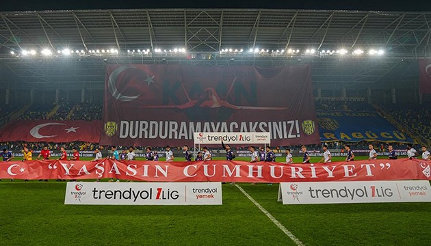 Tamamına yakını dolan tribünlere Türk bayrağı dağıtılırken, taraftarlar da "Şehitler ölmez, vatan bölünmez" sloganı attı.