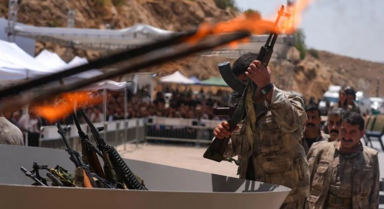Öcalan’ın çağrısı doğrultusunda örgüt, 11 Temmuz 2025’te Irak Kürt Bölgesel Yönetimi sınırları içindeki Süleymaniye kırsalında bir “silah bırakma töreni” düzenledi.