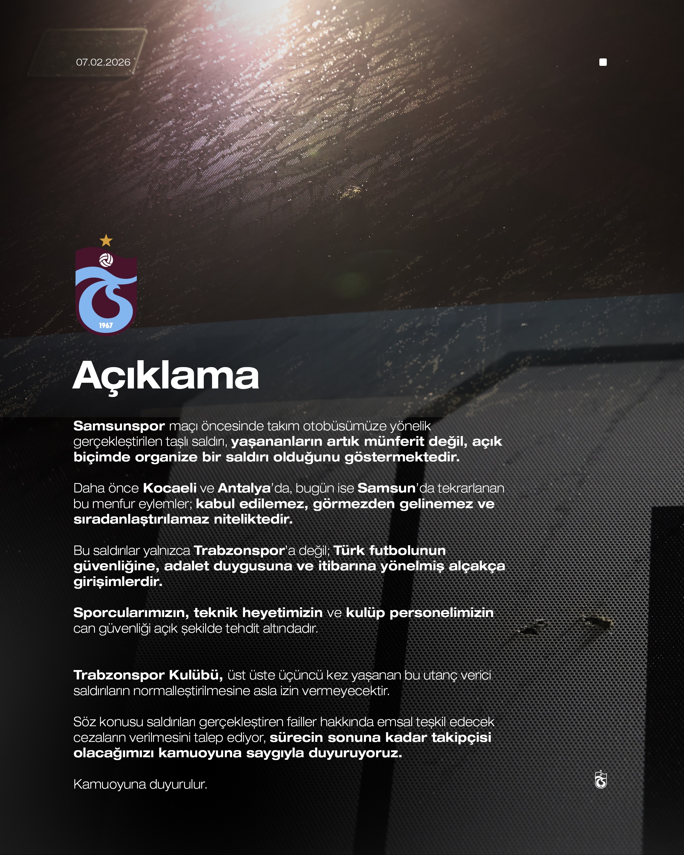 ''Samsunspor maçı öncesinde takım otobüsümüze yönelik gerçekleştirilen taşlı saldırı, yaşananların artık münferit değil, açık biçimde organize bir saldırı olduğunu göstermektedir. Daha önce Kocaeli ve Antalya’da, bugün ise Samsun’da tekrarlanan bu menfur eylemler; kabul edilemez, görmezden gelinemez ve sıradanlaştırılamaz niteliktedir. Bu saldırılar yalnızca Trabzonspor’a değil; Türk futbolunun güvenliğine, adalet duygusuna ve itibarına yönelmiş alçakça girişimlerdir. Sporcularımızın, teknik heyetimizin ve kulüp personelimizin can güvenliği açık şekilde tehdit altındadır. Trabzonspor Kulübü, üst üste üçüncü kez yaşanan bu utanç verici saldırıların normalleştirilmesine asla izin vermeyecektir. Söz konusu saldırıları gerçekleştiren failler hakkında emsal teşkil edecek cezaların verilmesini talep ediyor, sürecin sonuna kadar takipçisi olacağımızı kamuoyuna saygıyla duyuruyoruz. Kamuoyuna duyurulur''
