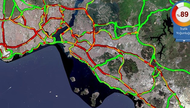 İstanbul Büyükşehir Belediyesi (İBB) Trafik Yoğunluk Haritası'na göre trafik yoğunluğu Avrupa Yakası'nda yüzde 87, Anadolu Yakası'nda ise yüzde 90'a kadar ulaştı.