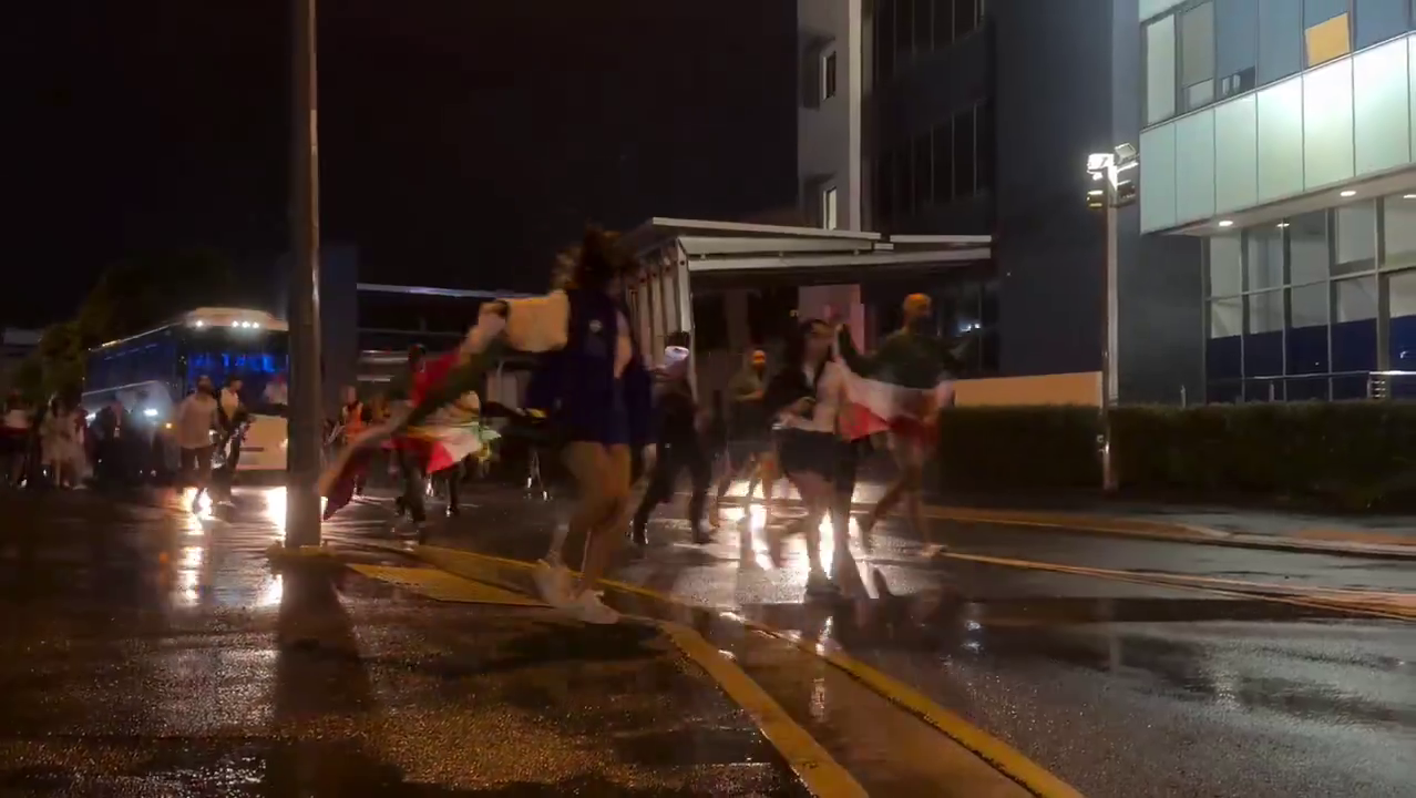 Bazı oyuncuların otobüs camından uluslararası yardım çağrısı olan "SOS" el işareti yaptığı görüldü.