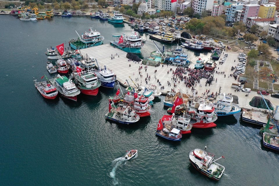 Türk ve Filistin bayrakları asılan teknelere, meydanda toplanan vatandaşlar da ellerindeki Türk ve Filistin bayraklarıyla destek verdi.