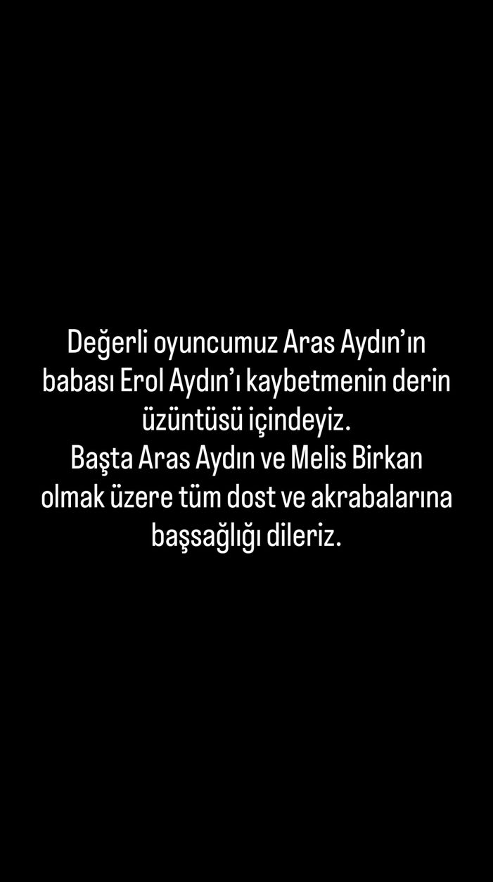 Aras Aydın'ın menajeri tarafından yapılan açıklamada, "Değerli oyuncumuz Aras Aydın, babası Erol Aydın'ı kaybetmenin derin acısı içindedir. Başta Aras Aydın ve Melis Birkan olmak üzere, tüm dost ve yakınlarına başsağlığı diliyoruz" denildi.