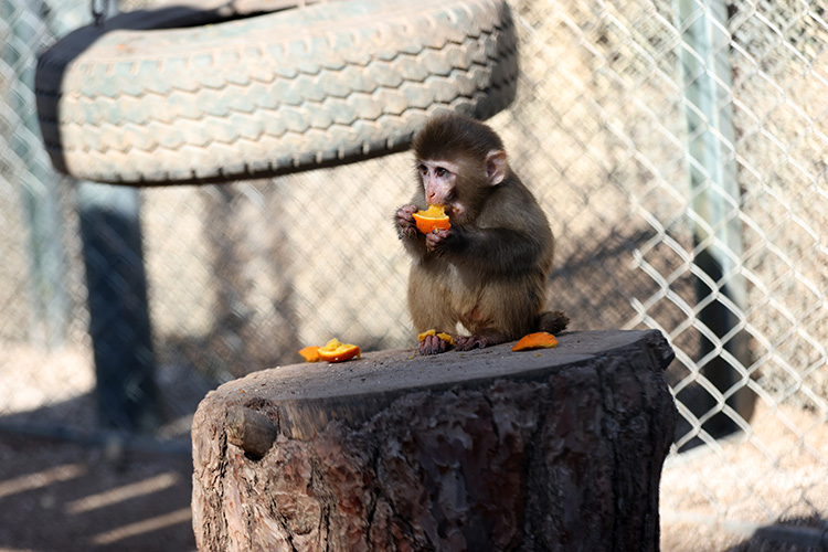 Sebze ve kuru yemiş ile beslenen maymun yavrusuna dengeli olarak da zaman zaman çok sevdiği için portakal da veriliyor.