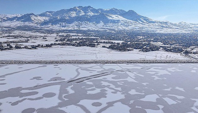 Dondurucu soğuklar nedeniyle Van-Özalp karayolunda sulama amaçlı kullanılan Sıhke Gölü'nün yüzeyi tamamen buz tuttu.