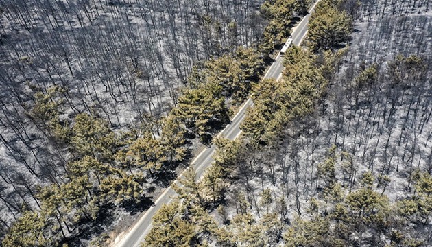 Türkiye'nin çeşitli illerinden gelen ekiplerin bölgedeki soğutma çalışmaları sürüyor. Büyük bölümü kızılçam ormanı olan yanan alanlar, dronla görüntülendi.