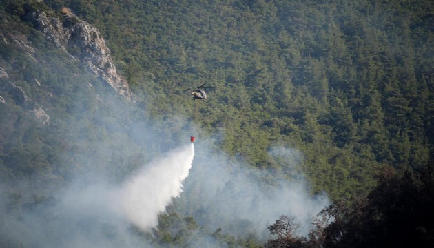 Rüzgarın etkisiyle ilerleyen yangına havadan helikopter ile müdahale edilmeye başlandı.