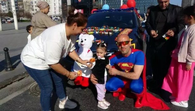 Park halindeki şeker kaplı arabayı ve Süpermen'i gören çocuklar heyecanla arabaya yaklaşarak çikolata ve şekerlerden paylarına düşeni aldılar.