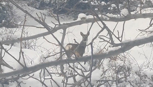 Beyaz örtüyle kaplanan bölgede yabani hayvanlar yiyecek bulmak için ormanlık alana yayıldı.