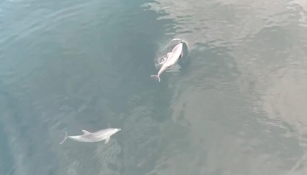 Güzel, 3 yunusun denizde oynadığını görünce onları dronla görüntülemek istediğini söyledi.